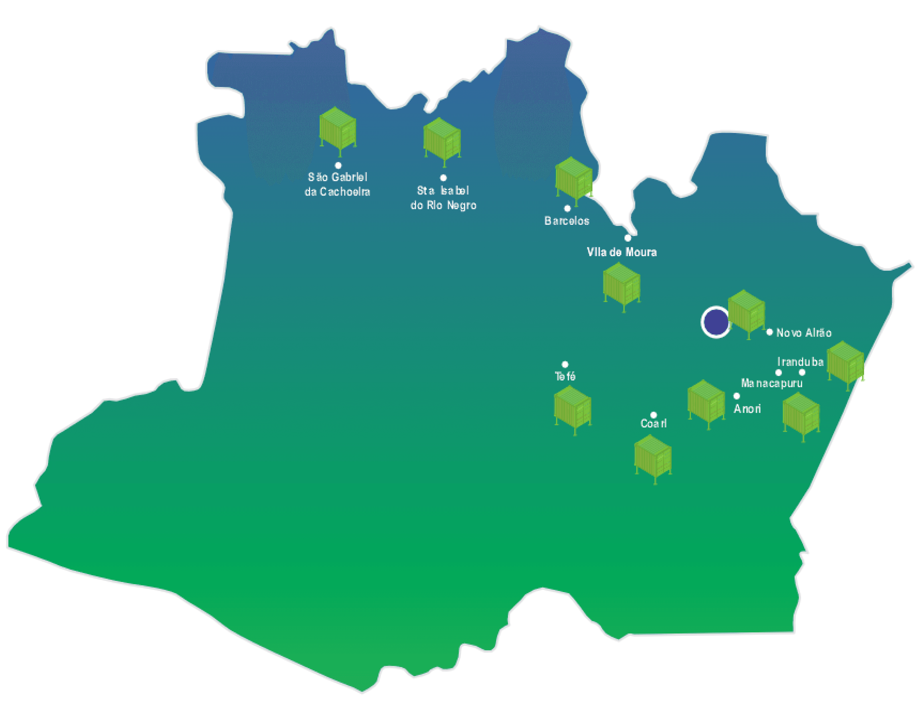 Anori (AM), Barcelos (AM), Coari (AM), Iranduba (AM), Manacapuru (AM), Novo Airão (AM), São Gabriel da Cachoeira (AM), Sta. Isabel do Rio Negro (AM), Tefé (AM) e Vila de Moura (AM).